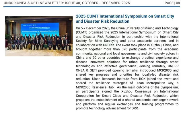On 5-7 December 2025, the China University of Mining and Technology (CUMT) organized the 2025 International Symposium on Smart City and Disaster Risk Reduction in partnership with the International Society for Mine Surveying and other academic partners, and in collaboration with UNDRR. The event took place in Xuzhou, China, and brought together more than 370 participants from the academic community, national and local governments and civil society actors in China and 20 other countries to exchange practical experience and discuss innovative solutions for urban resilience through smart technologies and effective governance. Joining remotely, UNDRR ONEA & GETI provided opening remarks, introduced MCR2030 and shared key progress and priorities for locally-led disaster risk reduction. Ulsan Research Institute from ROK joined the event and shared the resilience strategies of Ulsan Metropolitan City, a MCR2030 Resilience Hub. As the main outcome of the Symposium, all participants signed the Xuzhou Consensus on International Cooperation for Smart Cities and Disaster Risk Reduction, which proposes the establishment of a shared academic exchange network and platform and regular exchanges and training programmes to promote technology advancement for DRR.